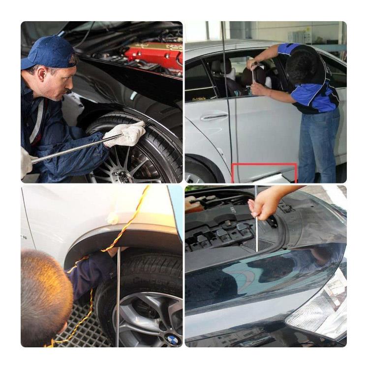 Access: The technician gains access to the backside of the dent, often through the trunk, door panels, or engine compartment.